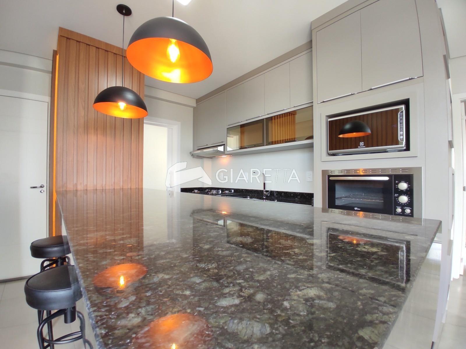- Cozinha planejada grande com bancada em granito, contém também 03 banquetas, fogão cooktop, depurador, forno micro-ondas, forno elétrico embutido, torneira, iluminação