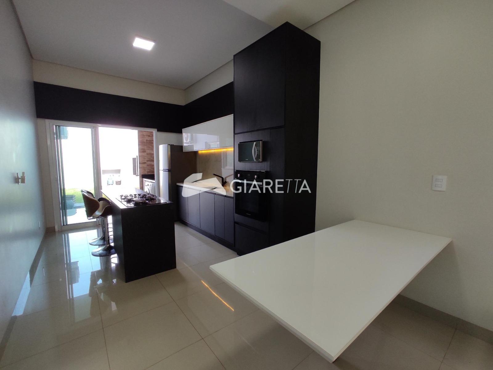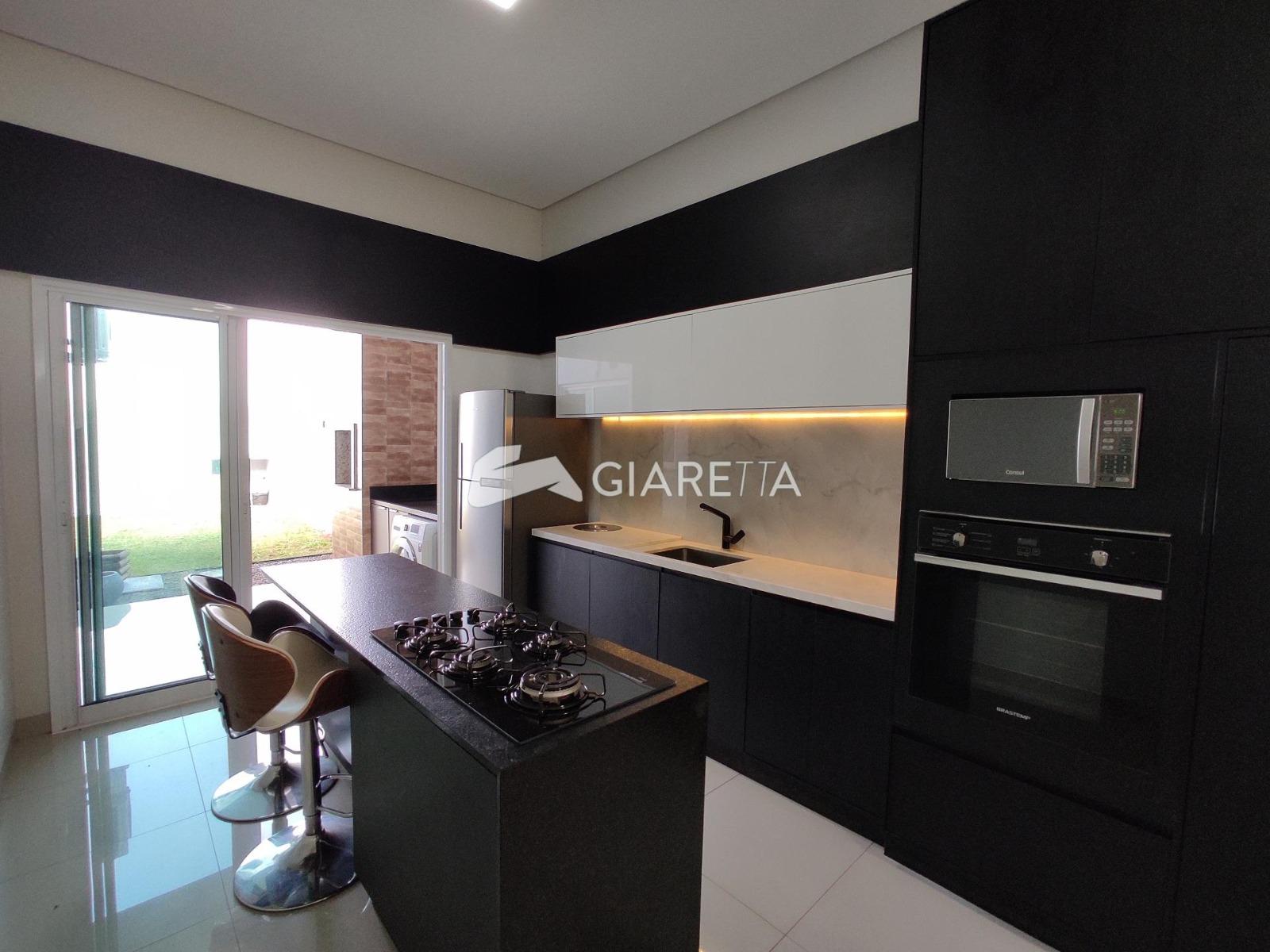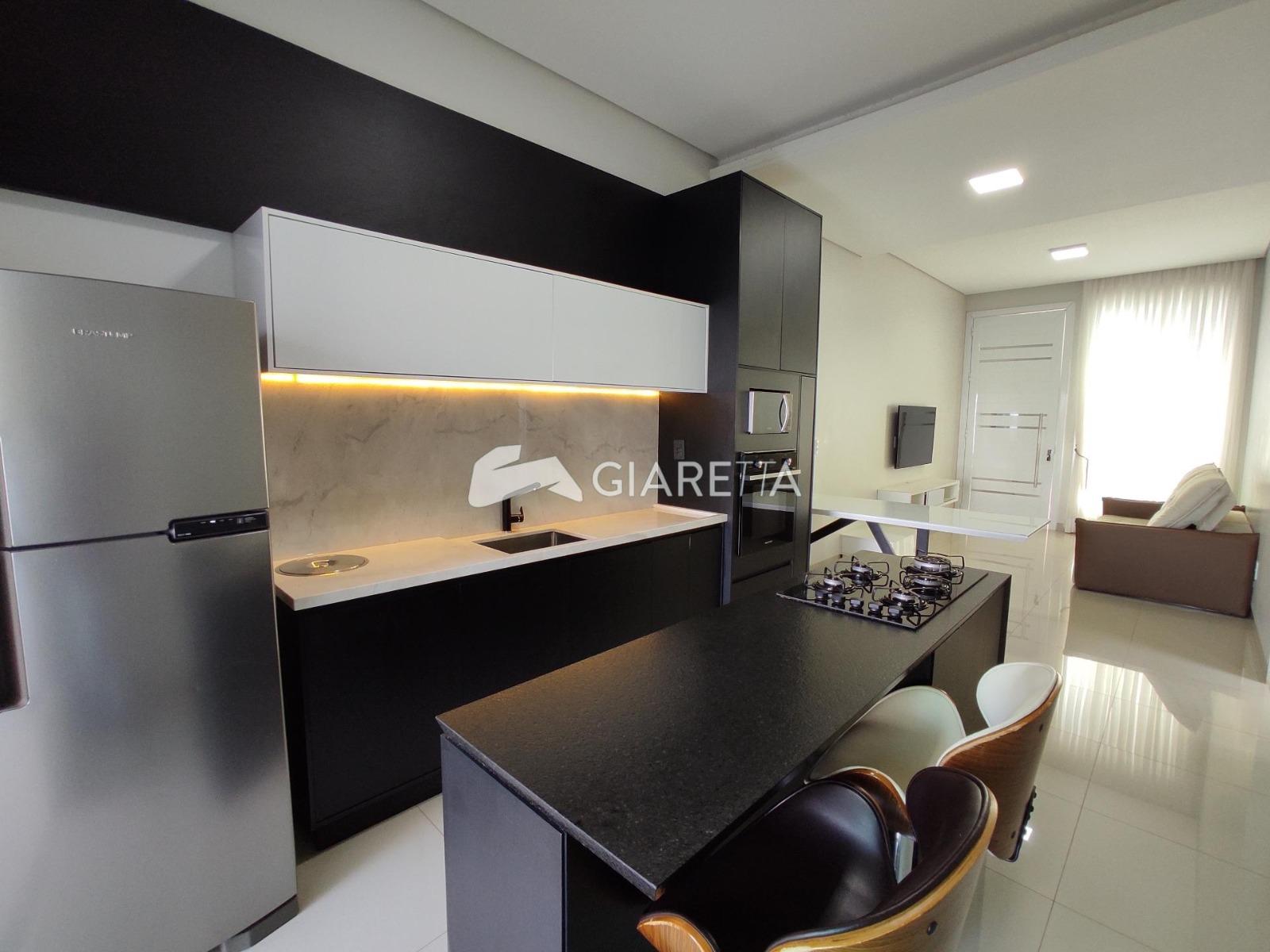 - Cozinha planejada com bancada, cooktop, geladeira, 02 banquetas, forno elétrico e micro-ondas